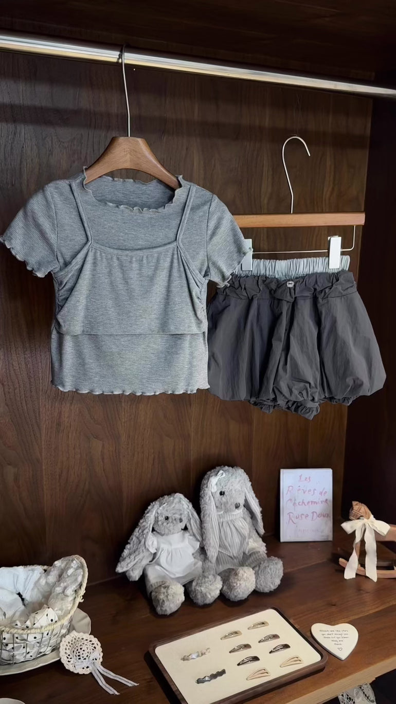 捲邊假兩件吊帶短袖